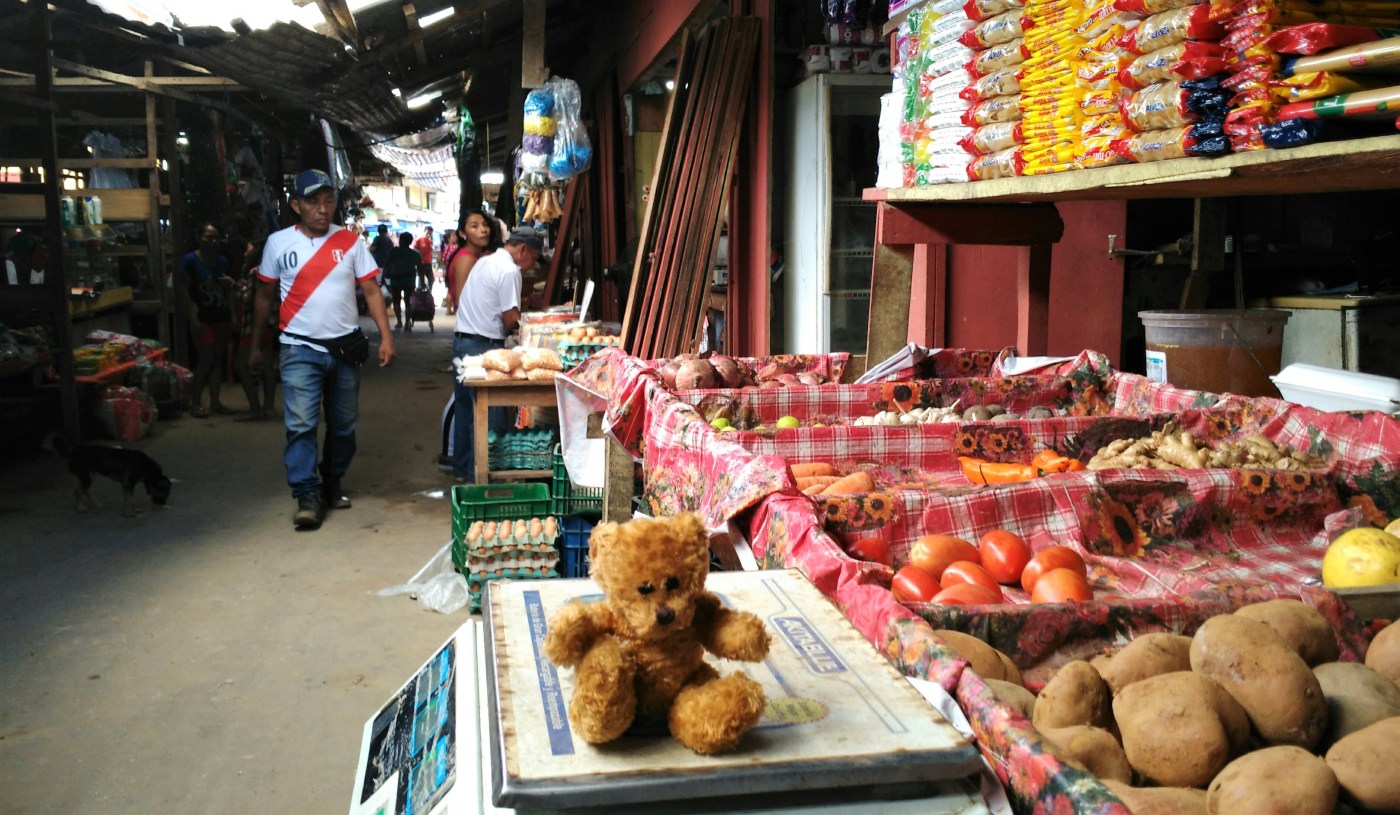 IMG_20181127_163923 Shopping is a bit different. There are a few main shops in the town but it isn’t like a supermarket, you say what you want and someone gets it off the shelf for you; you then have to go and pay someone else before coming back to get your shopping. (I managed to get my photo taken in the biggest shop). But most food comes from the market which is a very frightening place for a small bear because it is loud, busy and hard to understand what is going on. As you can see from the picture I got confused at one point and sat on some scales by mistake.