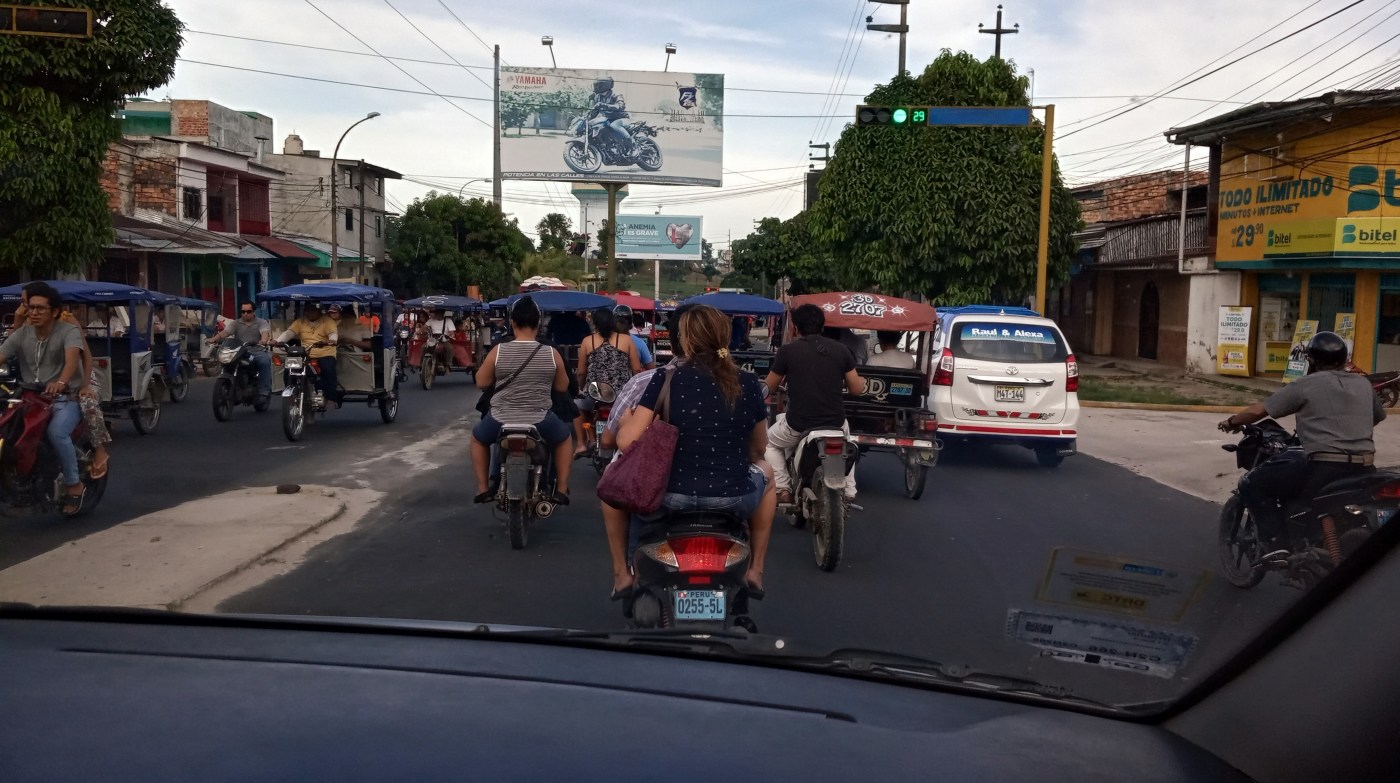 After about 75 minutes our pace noticeably slows as we reach the outskirts of Iquitos. We pass the airport and find ourselves three abreast (with only two lanes) competing for space with buses, cars, motorbikes and motokars. We often wonder that there aren’t more accidents. We crawl the last few kilometres, weaving through the traffic even where there doesn’t appear to be space. We take a right turn – only a few hundred metres more and we will have arrived – and then meet a checkpoint. The national police, fully armed, are pulling over all vehicles and asking to see the identity documents of everyone on board. They’re only really interested in those with Peruvian ID and collect up the ID cards to check their validity. After what seems like an age, but really only 10 minutes, they return everyone’s ID and we are free to drive the last 200m to the paradero in Iquitos. This is a regular, although not particularly frequent, occurrence and rarely in the same place twice but it wouldn’t be effective if it were predictable.